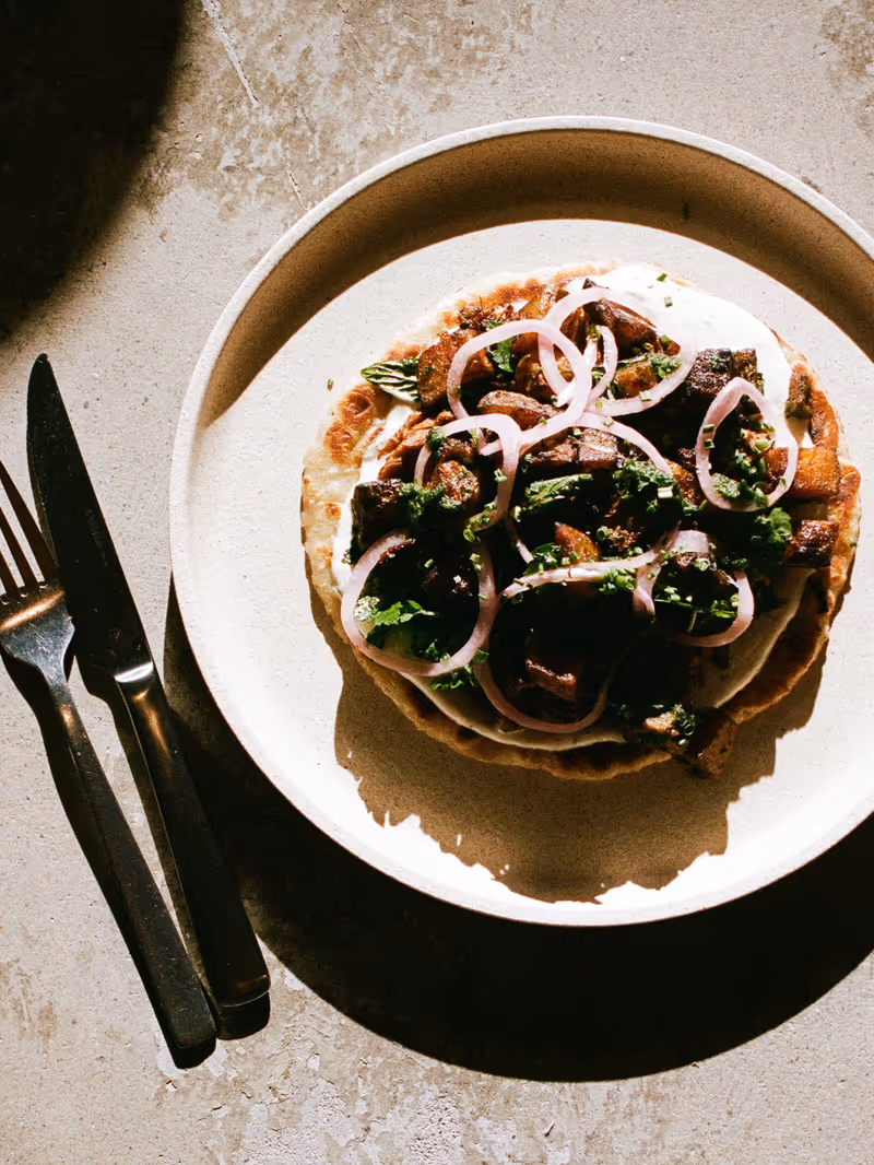House flatbread. Garlic Yoghurt. Braised lamb shoulder. Crispy spiced potatoes. Mojo Verde. Pickled onion. Soft herbs