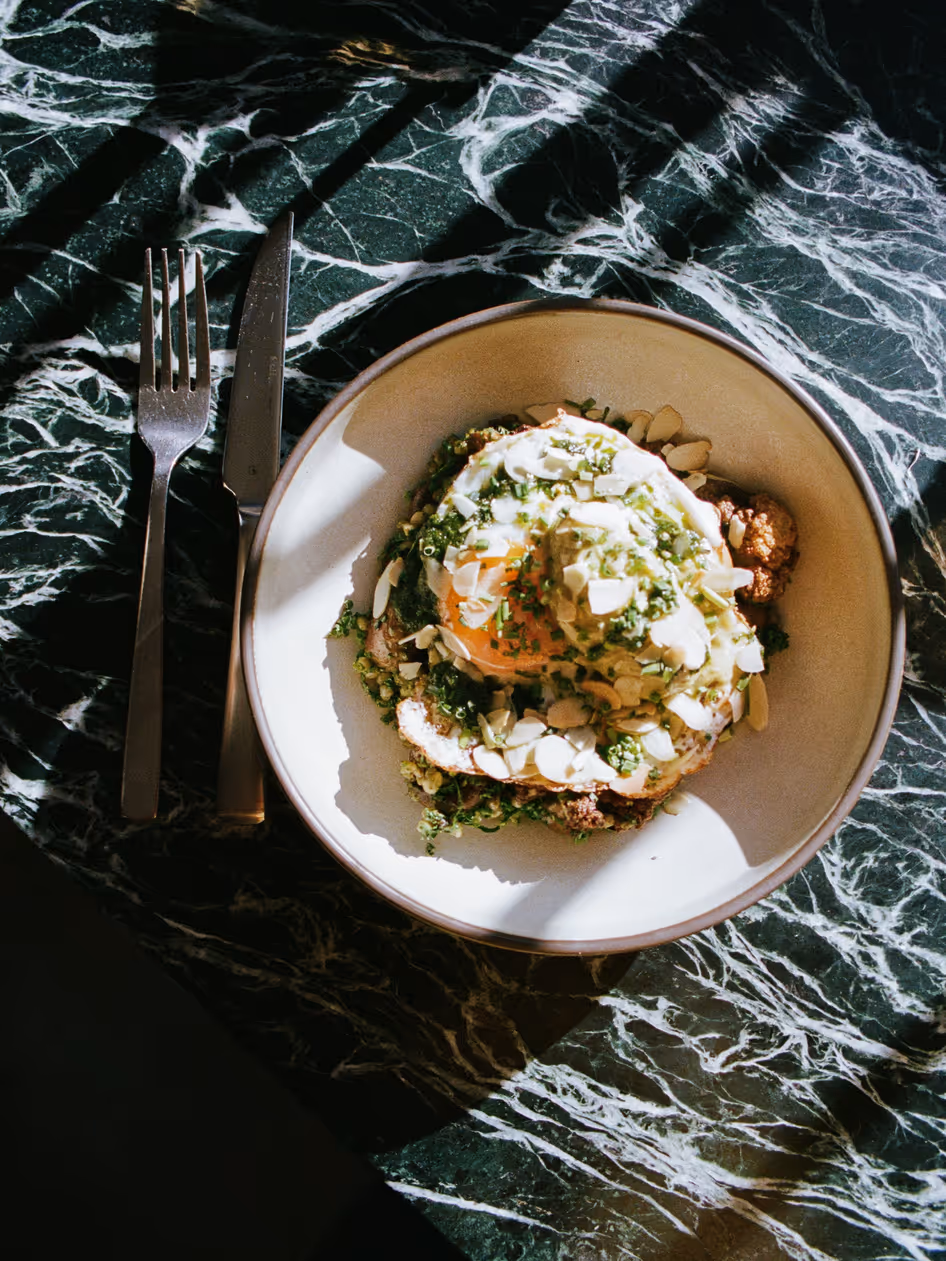Wholly crumpet. Fermented chilli. Organic egg scramble. Whipped feta. Fresh herbs. Crispy onion.
